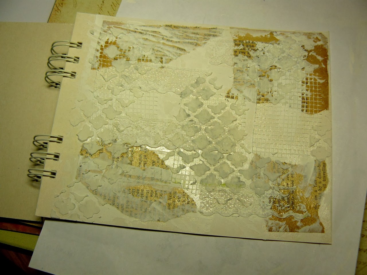 Zaczelam przyklejac elementy papierowe przytrzymujac gesso.