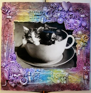 Uzylam oczywiscie gesso - biale medium, spray'ow, stempli (kocham je) oraz  szablony.